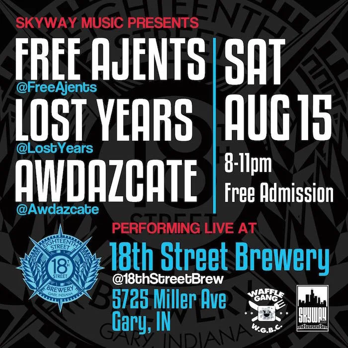 This night is going to be ridiculous! We welcome back our friends from Skyway Music, FREE AJENTS! These dudes ALWAYS bring raw energy and power to their performance. This go around they'll have special guests LOST YEARS and AWDAZCATE with them. This live musical performance is free of charge (b/c we love you) and open to the public.